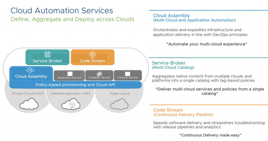 General Availability of Cloud Automation Services The Cloud Automation Services, including Cloud Assembly, Service Broker and Code Stream are now generally available – Sign up for a free 30-day trial today! Our cloud automation services make it easy and efficient for IT and developers to get what they need to build and deploy applications. The post Announcing General Availability of Cloud Automation Services appeared first on VMware Cloud Management.